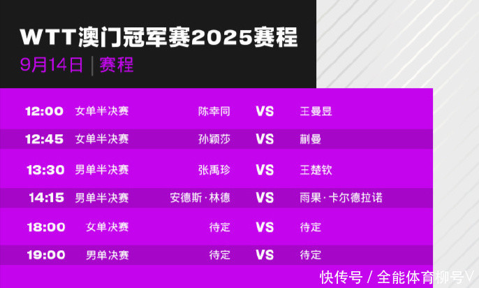 北京时分9月14日音问,2025年WTT澳门冠军赛陆续进行,CCTV5直播比赛实况。女单半决赛将演出两场中国德比战,寰宇第一“小魔王”孙颖莎对阵队友蒯曼,寰宇第二“鳗鱼”王曼昱对阵队友陈幸同。