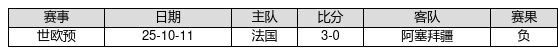 阿塞拜疆 VS 法国两队近10年的交战次数为1场,阿塞拜疆0胜0平1负,赢球概率为0.0%,平局概率为0.0%,输球概率为100.0%。
