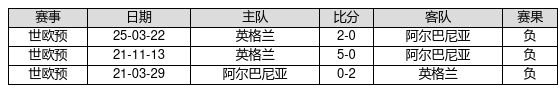 阿尔巴尼亚 VS 英格兰两队近10年的交战次数为3场,阿尔巴尼亚0胜0平3负,赢球概率为0.0%,平局概率为0.0%,输球概率为100.0%。