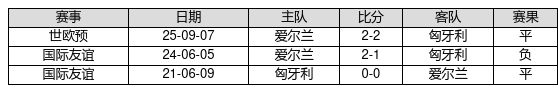 匈牙利 VS 爱尔兰两队近10年的交战次数为3场,匈牙利0胜2平1负,赢球概率为0.0%,平局概率为66.7%,输球概率为33.3%。