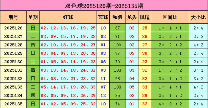 双色球上期开奖号码回来:红球01 02 05 09 25 32;蓝球10,红球号码大小比为2:4,三区比为4:0:2。蓝球开出大偶数10。