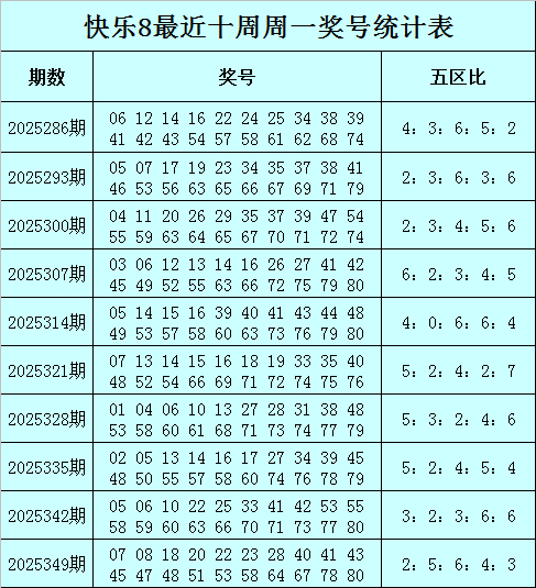 福彩快活8第2025349期(上周一)开奖回归:07 08 18 20 22 23 28 40 41 43 45 47 48 51 53 58 64 67 78 80,其中奖号五区比为2:5:6:4:3。